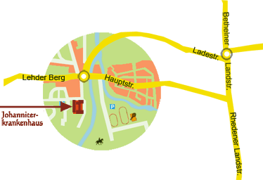 Der Fußweg führt in Richtung Haupthaus, dann folgt man der Be- schilderung entweder außerhalb oder innerhalb des Krankenhausgebäudes.